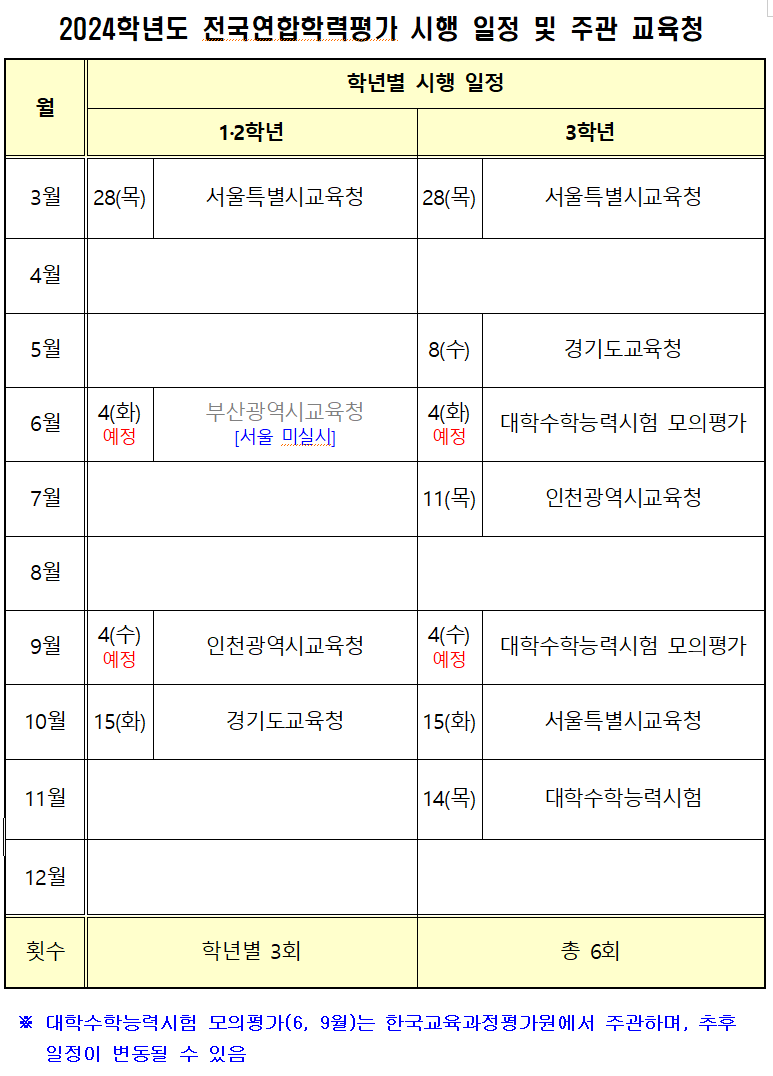 해당월마다 서울특별시교육청, 경기도교육청, 인천광역시교육청, 부산광역시교육청이 돌아가면서 출제를 하고 고등학교 3학년은 6월과 9월 두번의 시험은 대학수학능력시험 모의평가라고 해서 수능 주관사인 한국교육과정평가원에서 출제를 하게 돼요. 6모, 9모 이런 얘기 많이들 들어봤죠?