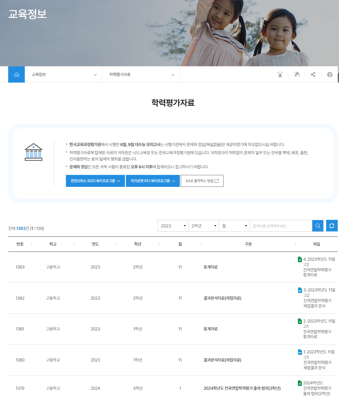 학력평가자료로 들어가면 이렇게 몇 년도 몇 학년 몇 월 문제를 선택해서 다운로드하여 풀어볼 수 있어요.