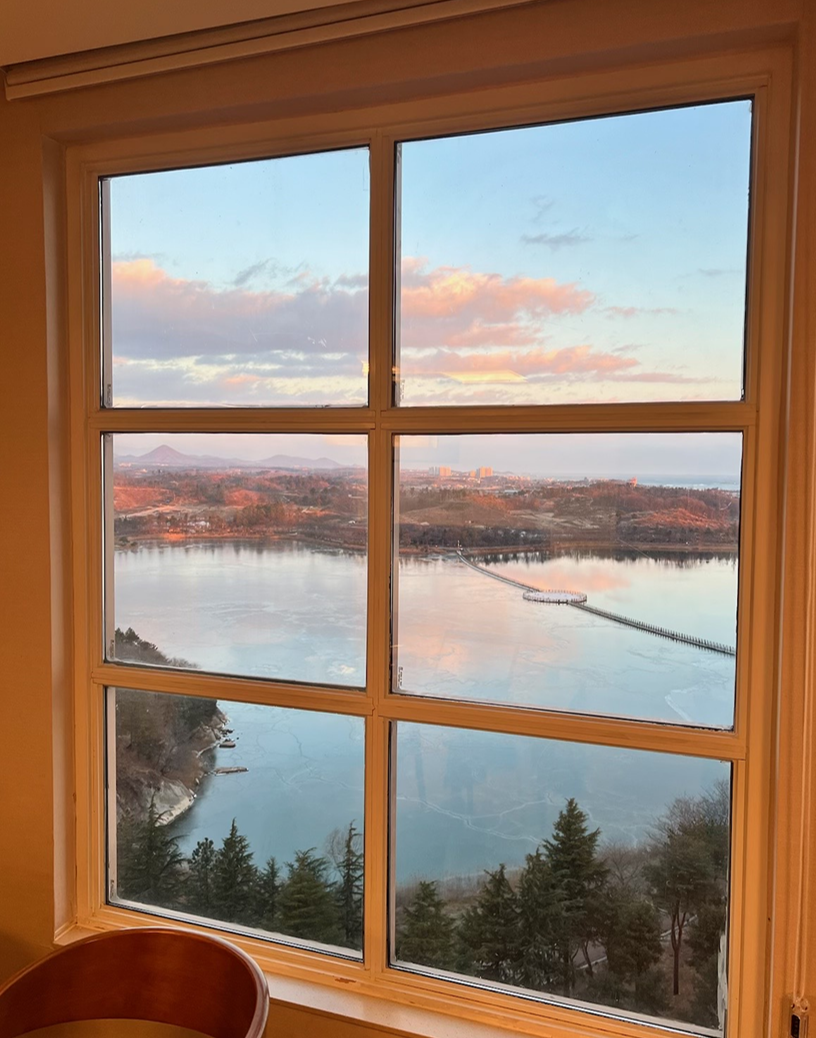 숙소에서 바라본 보습이에요. 제가 적어도 한 달에 한 번은 속초여행을 간다고 했잖아요. 그래서인지 위 사진은 겨울이고 아래 사진은 단풍 든 가을 모습이네요. 숙소에서 창밖으로 보이는 호숫길이에요. 참 예쁘죠. 그림 걸린 액자 같아요.