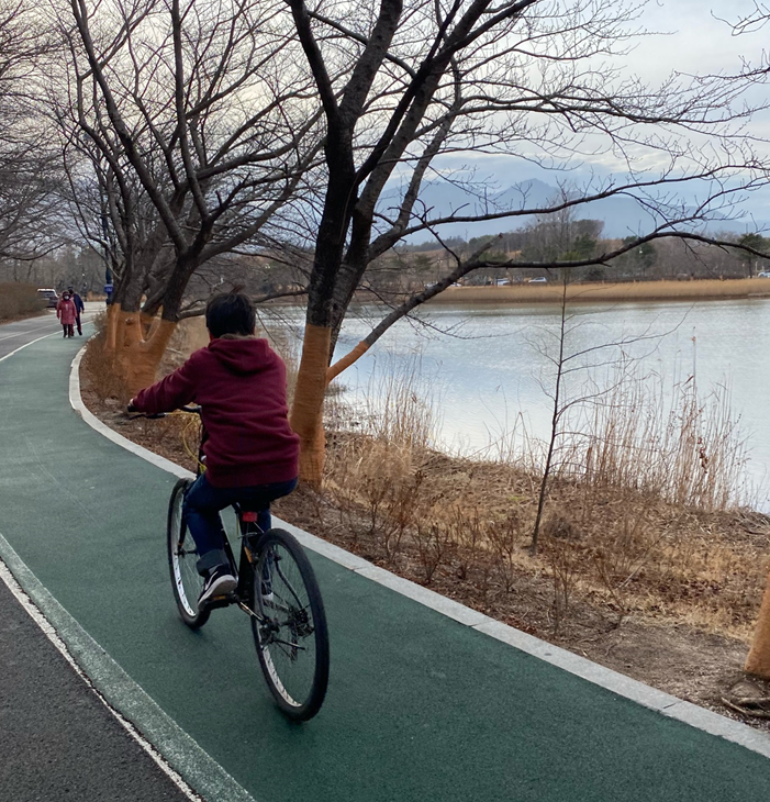 작은 아이도 여기서 자전거를 처음 배웠어요. 한번 구를 줄 알더니 다음날에는 한 바퀴 잘 돌더라고요. 차가 거의 안 다니고 자전거길이 잘 되어 있어서 안전하게 탈 수 있는 좋은 곳이에요.