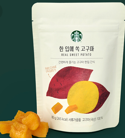 국내산 고구마로 만든 반건조 고구마예요. 고구마 말랭이 다들 아시잖아요. 쫀득하고 달달한 맛이 아주 좋습니다. 간편하게 즐길 수 있도록 한입크기로 되어 있는 핑거 푸드죠. 생각보다 양도 많아서 아이들이 즐기기에 좋아요. 아이들은 먹다 보면 흘리는 게 반이잖아요. 많이 흘려도 많이 남는다는 거죠. 가격은 3,800원입니다.