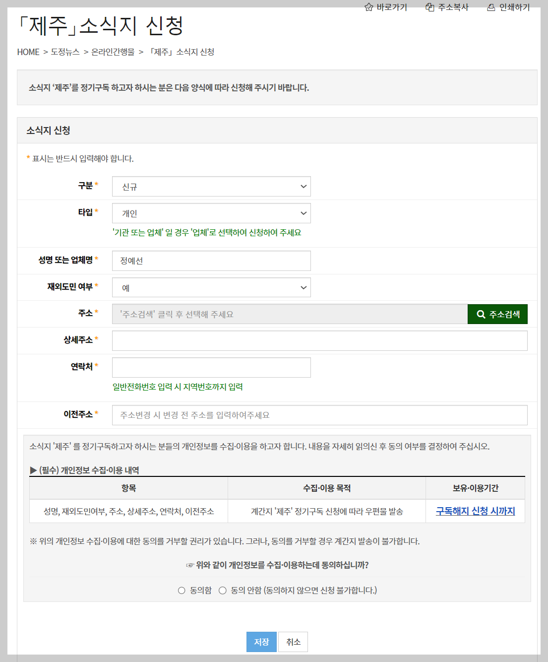 5. 제주 소식지 신청란에 주소 및 정보 기입