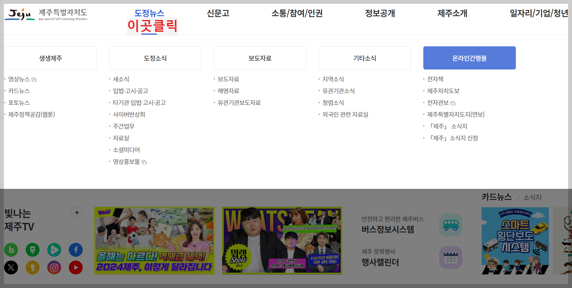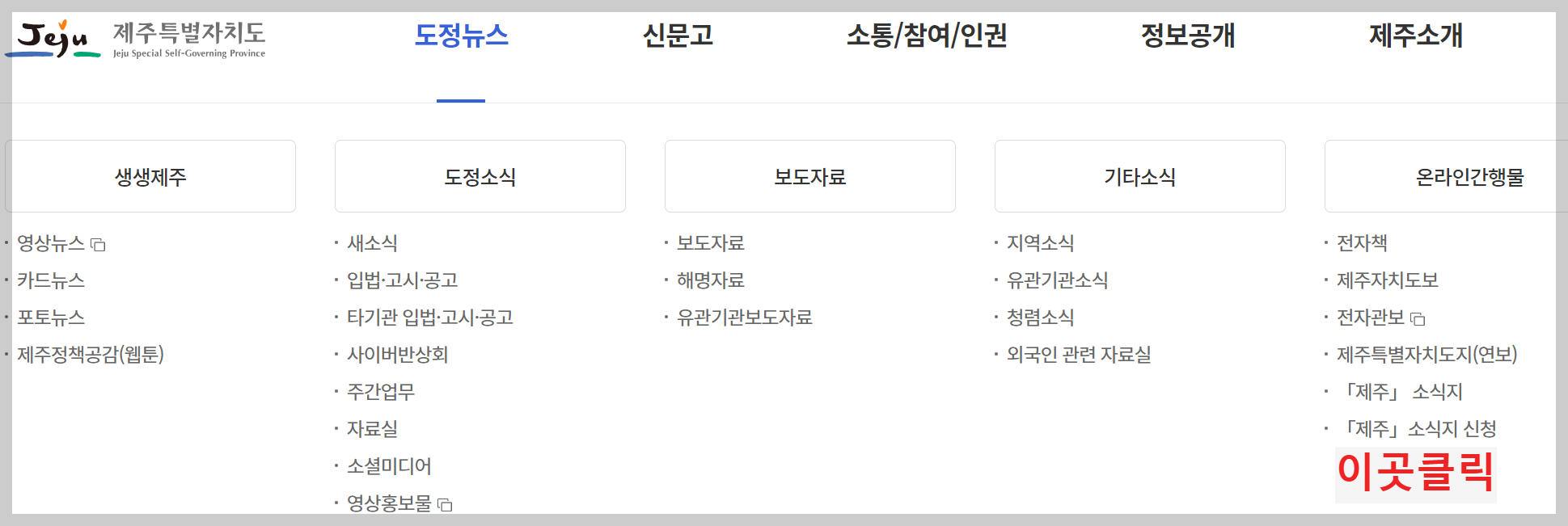 2. 도정뉴스에 마우스를 올린 후 온라인 간행물 속의 마지막 메뉴 '제주'소식지 신청 클릭