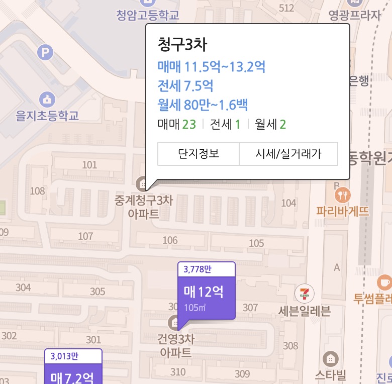 중계 청구3차 아파트 780세대 : 매매 11.5억~13.2억, 전세 7.5억