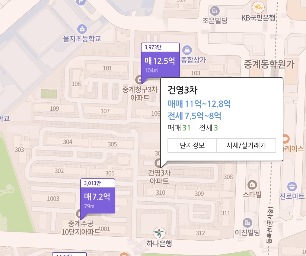 중계동 은행사거리 건영3차 청구3차 아파트 전세 시세 | 동북선 개통