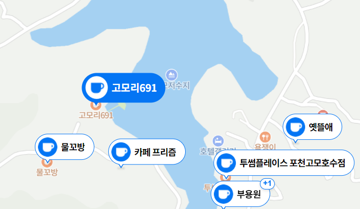 호수 주변에 있는 카페를 지도에 찍어봤어요. 참 많죠?