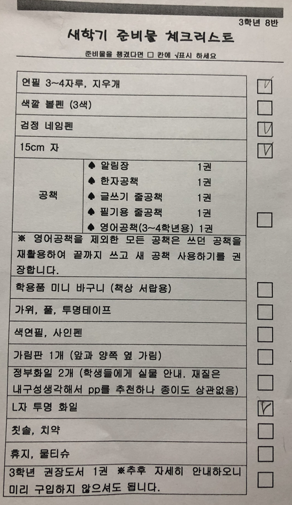 그래도 학기초에 꼼꼼하신 담임 선생님께서는 가지고 다녀야 할 사물들을 쭉 적어서 리스트를 보내주시더라고요.