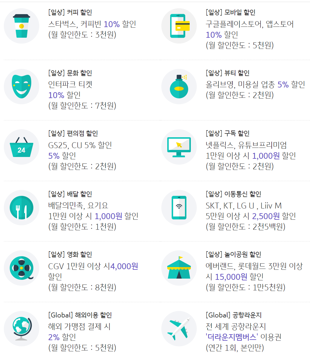공항라운지 무료 이용(상,하반기 각 1회) 혜택과 더불어 ▲일본 3대 편의점 5% ▲베트남 그랩(Grab) 및 롯데마트 5% ▲미국 스타벅스 5% 등 다양한 할인 혜택을 연회비 없이 이용할 수 있으니 해외여행을 앞둔 여행객에게는 고민없이 선택해야 하는 카드로 생각됩니다.