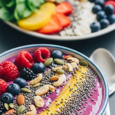 - 재료: 삶은 퀴노아 1/2컵, 무가당 플레인 요거트 1컵, 냉동 베리류 1/2컵, 치아씨드 1큰술, 견과류 약간